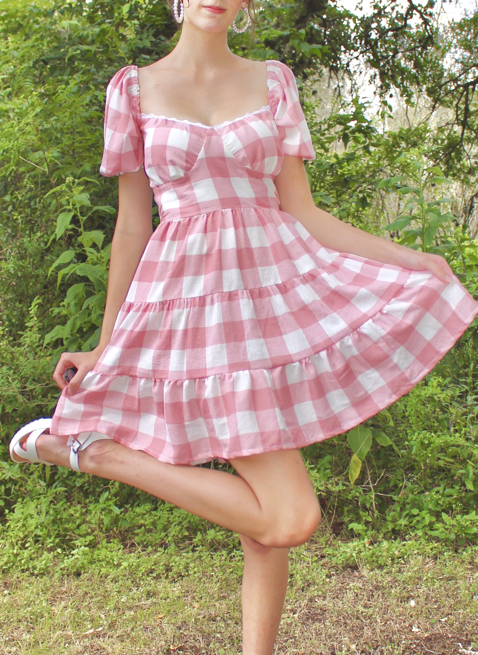 This is a physical garment, and is one of a kind. This dress is handmade by me, and is in perfect condition. It is made out of a lightweight gingham fabric in a pretty desaturated pink color. The dress fits like a small or medium, and the models measurements are waist: 26”, bust: 34”, and the skirts length is 19.5”.